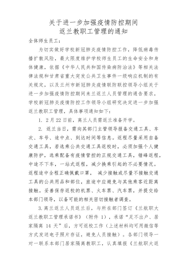 关于进一步加强疫情防控期间返兰教职工管理的通知